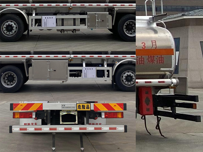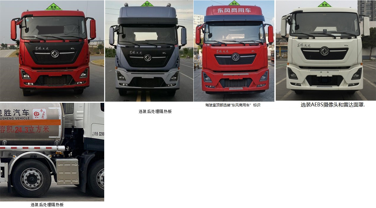 | 其它: | 1、该车适用于危险品运输,运送危险货物车辆类型为:FL型。准运介质最大密度:850千克/立方米,罐体总容量24.3立方米,罐体有效容积23.64立方米,罐体外形尺寸(长×宽×高)(mm):8200×2300×1600。2、侧防护材料为铝合金,螺栓连接;后防护材料为Q235,螺栓连接,截面尺寸(mm)80×140,下边缘离地高480mm。3、仅采用轴距(mm):1995+4500+1350。随底盘选装平顶驾驶室;选装驾驶室前面罩;高顶驾驶室顶部气喇叭为选装件;驾驶室前角扰流板为选装件,选装驾驶室顶部"东风商用车"企业标识,选装AEBS摄像头和雷达面罩。选装后处理隔热板。仅选用排气管前置、限速装置(限速80km/h)、前轮盘式制动及子午线轮胎的底盘,转向轮安装爆胎应急防护装置,后轴采用空气悬架。安装带卫星定位功能的行驶记录仪。EBS型号/生产厂家:EBS5/东科克诺尔商用车制动系统(十堰)有限公司,VIE EBS/ESC-Ⅱ/浙江万安科技股份有限公司。发动机/油耗值(L/100km)对应为DDi75E350-60/38.1,L9NS6B400/38.2。4、选装ETC。罐体上部选装上走道,左右侧后部选装工具箱,选装左侧工具箱样式。第二轴选装弧形胶制挡泥板或方形挡泥板。 | ||