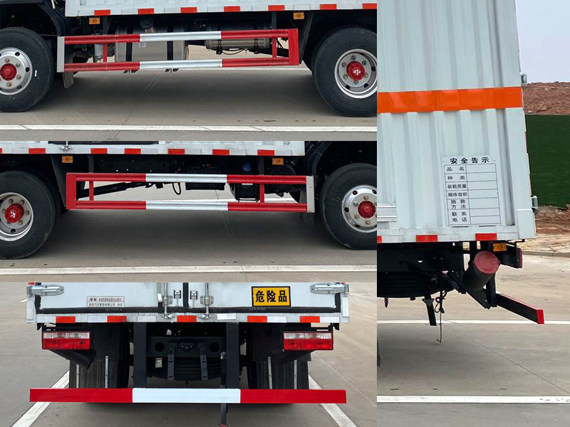 其它:1、该车为危险品运输车,运输具有独立容器(瓶)包装的物品,运送危险物品类项号:9。厢体顶部封闭,不可开启。2、侧、后防护材料均为Q235,侧防护螺栓连接,后防护焊接,截面尺寸(mm)100×50,下边缘离地高450mm。3、仅选用排气管前置、限速装置(限速80km/h)、前轮盘式制动及子午线轮胎的底盘,转向轮安装轮胎爆胎应急防护装置。安装带有卫星定位功能的行驶记录仪。ABS系统控制器型号/生产厂家: ABS/ASR-24V-4S/4M/襄阳东风隆诚机械有限责任公司。发动机/油耗值(L/100km)对应关系为: ZD30D16-6N/17.2,YCY24140-60/16.5, NV30-C6G/17.3, CY4SK261/17.4, YCY30165-60/17.5, CY4BK361/17.9。选装ETC。随底盘选装驾驶室。厢体侧面选装开门型式及位置,选装不带侧开门,选装厢体样式,厢体侧面板选装开百叶窗。仅采用轴距3308mm。