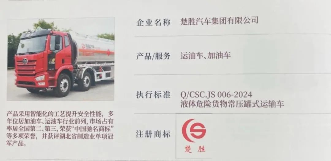 2025年4月9日,湖北省“湖北精品”认定榜单正式发布!楚胜汽车集团自主研发的加油车、运油车系列产品,历经技术先进性、质量稳定性、市场认可度、品牌影响力四重严苛考核,从全省制造业优品中脱颖而出,成功获此省级质量标杆认证!这一荣誉不仅彰显了楚胜在专用车领域的技术制高点地位,更以权威背书印证了“中国质造”的硬核实力!